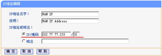 然后继续在“LAN”区域新增一个IP地址对象,这次是要将TL-FR5300面向Internet的WAN口IP地址作为“对象”体现出来,在配置策略的时候会用到,如下图: