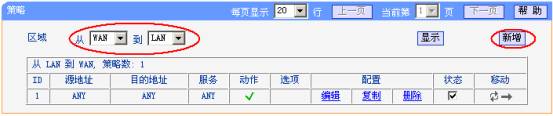 因为我们即将在“策略”里面定义的规则是TL-FR5300转发从WAN口收取到的数据包并发往内网的服务器,在这个过程中数据包是从WAN口到LAN口方向的,所以上图中的“区域”需要选成“从WAN到LAN”,然后点击“新增”按钮,如下图: