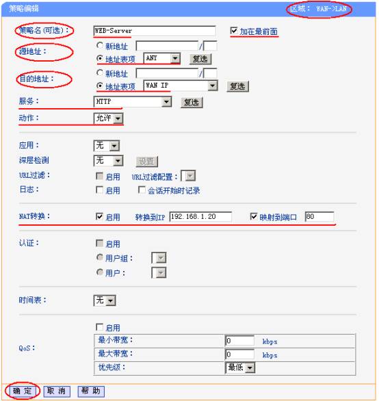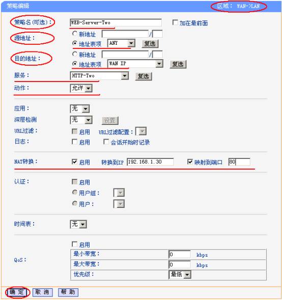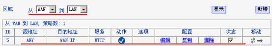 - 经过上面这几个参数的配置后,策略就算是设置完成了,最后点击“确定”按钮就行了。如下图可以看到从WAN——>LAN新增了一条策略,策略的源地址ANY表示任何源地址,发送到目的地址也就是TL-FR5300的WAN口IP ,数据包访问的是HTTP 80端口,那么TL-FR5300就将数据包转发至内网。
