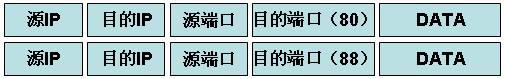 在本文档一开始我们就对从Internet访问过来的数据包结构进行了分析,数据包结构里面有“目的端口”这个参数,假设Internet上的主机要访问TL-FR5300内网192.168.1.20上面建立的WEB服务器,根据上面策略的配置处于外部互联网上的主机只需要在IE浏览器里面通过http://222.77.77.233就可以访问192.168.1.20上建立的WEB服务器了,如果这时候外部主机想要访问建立在192.168.1.30上面的WEB服务器,那么还能通过http://222.77.77.233访问吗?那当然不行了!都是同样的http://222.77.77.233访问过来,都是访问目的端口是80的服务,数据包结构没有任何差异,TL-FR5300作为机器怎么可能知道该转发给192.168.1.20还是192.168.1.30 ?所以,外网主机想要访问建立在192.168.1.30主机上的WEB服务,在访问的时候需要通过不同的参数来表达自己想要访问的是内网的那台主机?比如可以通过http://222.77.77.233:88,也就是说数据包的“目的端口”不是默认的80端口了而是88端口,如下图的对比,这样当不同的数据包发送过来的时候TL-FR5300就可以分辨了: