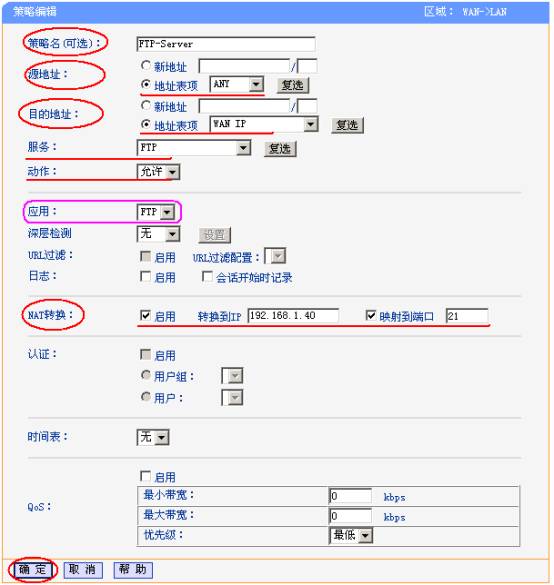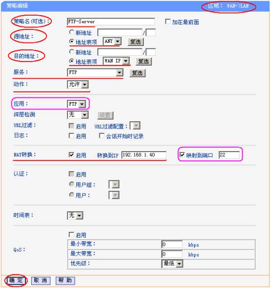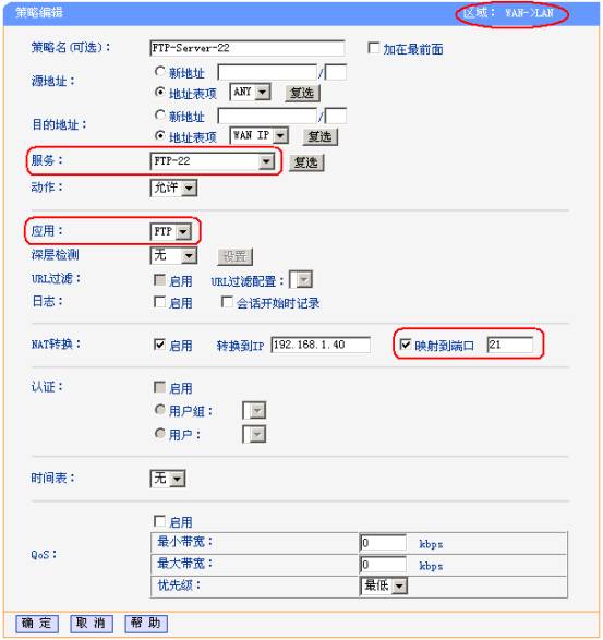 就像本文档前面描述的,“自定义服务”可以用于描述外网访问过来的数据包的源和目的端口,设置完后点“确定”。那么这条新增的名为“FTP-22”可以作为对象被策略引用。接下来就是配置策略了,仍然是从WAN——>LAN的策略: