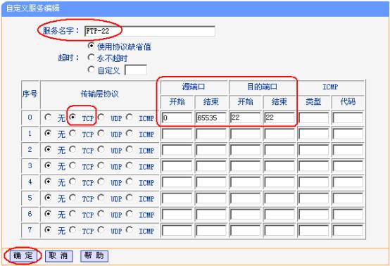 - “服务”——选择我们在前面对象里面配置的“自定义服务”FTP-22 。