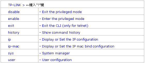 2) 键入一命令,后接以空格分隔的“?”,如果该命令行位置有关键字,则列出全部关键字及其简单描述。例如: