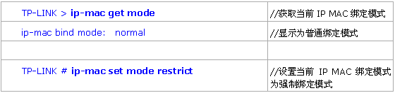 ip-mac命令。您可以使用该命令查看或设置当前系统中IP MAC绑定的模式。设置功能只能在特权模式下使用,查看命令可以在用户模式和特权模式下使用。IP MAC绑定的模式有两种:普通绑定模式(normal)和强制绑定模式(restrict)。