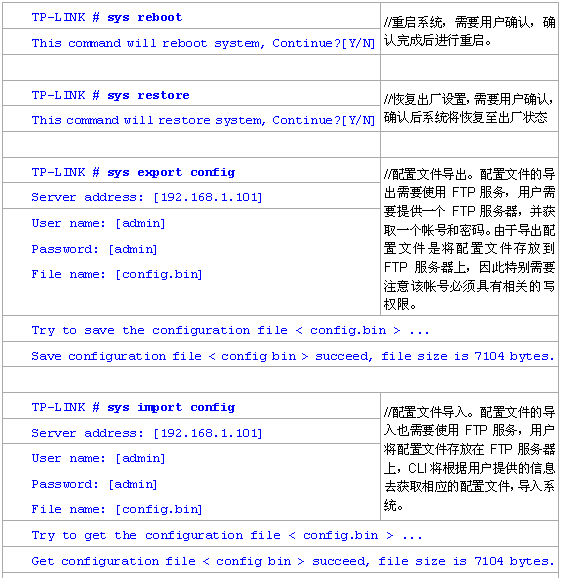 sys命令。您可以使用该命令进行相关的系统管理操作,包括配置文件的导入导出、恢复出厂设置、重启系统和升级软件等。