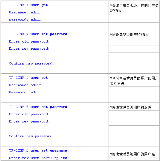 user命令。您可以使用该命令查询或修改路由器的用户名和密码。在用户模式下,您可以修改参观级用户的密码,由于参观级用户和管理员用户共用一个用户名,因此在用户模式下不能修改用户名;在特权模式下您可以修改管理员级用户的用户名和密码。