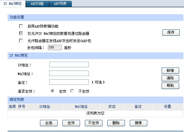 仅允许IP MAC绑定的数据包通过路由器:开启此功能之后路由器不再学习更新自己的ARP表,只允许完全符合已绑定ARP条目的数据包通过路由器。表现为新接入路由器的计算机,若没有添加IP与MAC地址对应关系,该计算机是不能与路由器进行通讯的。或者路由器下的计算机更改了其IP地址,导致与路由器上记录的IP与MAC对应关系不一致,也无法进行通讯。