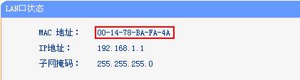 a、登陆到路由器上,查看“运行状态”―>“LAN口状态”,上面有路由器的MAC地址信息;