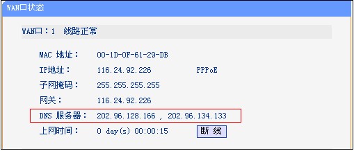 这种情况下,首先您必须知道您本地的DNS服务器地址。如果您是静态IP上网,您可以打电话向您的网络服务商咨询。如果您的上网方式中的IP和DNS的值是动态获取的(包括PPPOE拨号),首先请您登录路由器的管理界面,查看路由器WAN口所获取的DNS的值,并且把它记下来。要查看路由器WAN口获取的DNS值,您可以直接在我们路由器的管理界面中的‘运行状态’-‘WAN口运行状态’处查看。