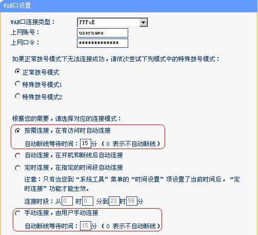 该方式下,路由器不会自动进行PPPOE拨号,当网络中有数据要与外网进行通信时,路由器才会进行PPPOE拨号。对于按时间上网收费的用户,可以使用该上网方式。设置自动断线时间,在该时间内,若没有数据与外网通信,路由器会进行断开PPPOE连接。