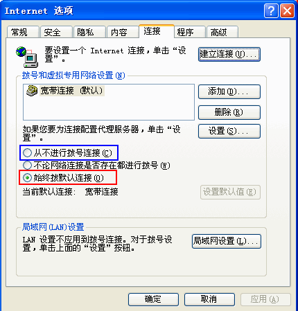 在IE浏览器的“工具”选项中,如果将“Internet选项”->“连接”设置为“始终拨默认连接”(如图1),就可能会弹出自动拨号连接(如图2),这时只需要将之前设置的“始终拨默认连接”改为“从不进行拨号连接”,问题即可得到解决。