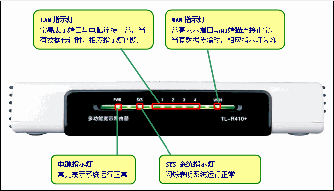 若SYS等常亮或者熄灭,表明路由器出现故障;LAN或者WAN指示灯不亮,请检查物理连接是否接好,比如没有接网线或者是网线与接口接触不良;若连接正常但指示灯不亮,则可能是网线问题,建议您更换网线。