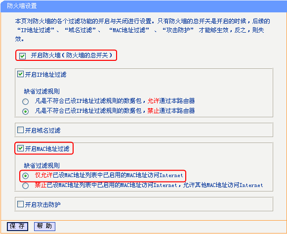 开启MAC地址过滤功能时,必须要开启防火墙总开关,并明确MAC地址过滤的缺省过滤规则(设置过程中若有不明确处,可点击当前页面的“帮助”按钮查看帮助信息):