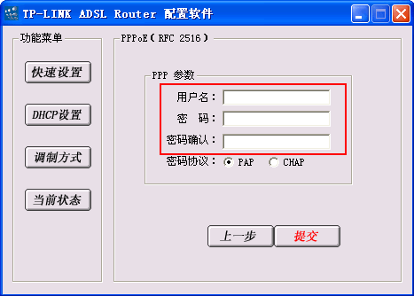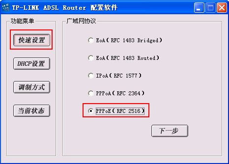 选择快速设置-PPPoE(RFC2516),点击下一步。
