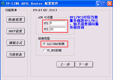 填写正确的VPI/VCI(VPI/VCI值一定要正确,否则将无法上网),选择LLC/SNAP封装,点击下一步。