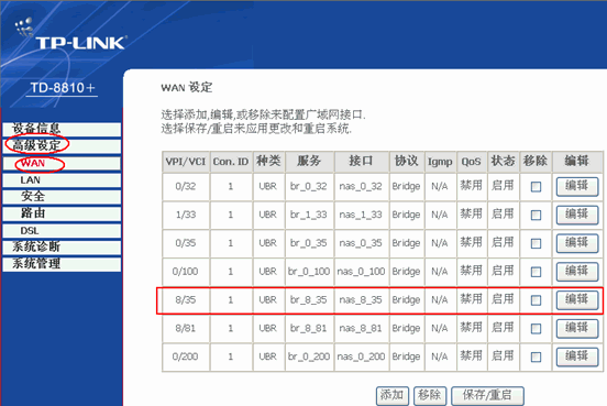 高级设定-WAN,选择正确的VPI/VCI(对应当地服务商的VPI/VCI值,如不清楚请咨询服务商,这里以8/35为例),点击编辑。