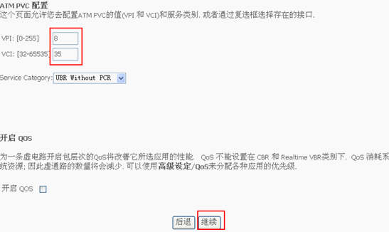 如果您需要的VPI/VCI值不在设备默认提供的条目中,可以在该步骤中修改,ServiceCategory保持默认,点击继续。