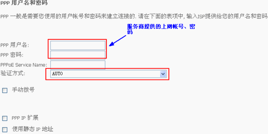 PPP用户名/密码:服务商提供的上网帐号、密码;