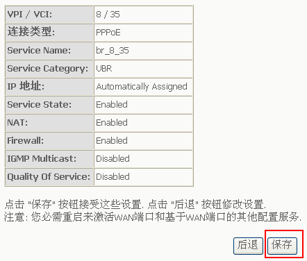 回到WAN设定页面,此时可以看到设置的VPI/VCI条目协议为PPPoE,点击保存/重启,设备重启后设置生效。