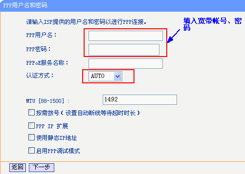 PPP用户名/密码填入宽带帐号/密码,如不清楚请咨询服务商,PPPoE服务名称可不填或者按照服务商的要求填写,认证方式选择AUTO,点击下一步。