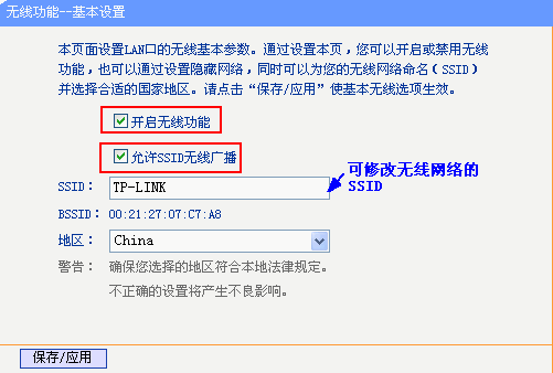 在无线功能-基本设置,可设置无线网络的基本参数,开启无线功能、允许SSID无线广播均勾选(默认勾选),SSID可自行输入,点击保存/应用生效,设置完毕。