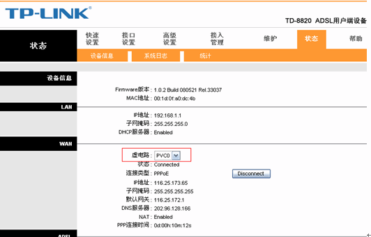 在浏览器中输入TD-8820的管理地址(默认为192.168.1.1),登录管理界面-状态中查看当前使用路由模式拨号的PVC虚电路(本例中为PVC0)。