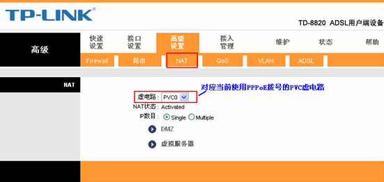 选择高级设置-NAT,虚电路选择拨号的PVC(本例选择PVC0)。