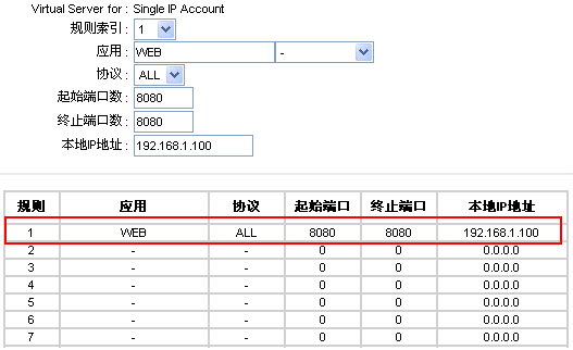 本例使用WEB服务器端口为8080,服务器IP地址192.168.1.100,添加相应的端口映射条目如。