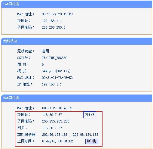 点击“完成”,设置结束,在“运行状态”中可以查看WAN口状态。如果WAN口状态中显示已经获取到了IP地址、子网掩码、网关、DNS服务器地址,路由已经成功连上Internet。