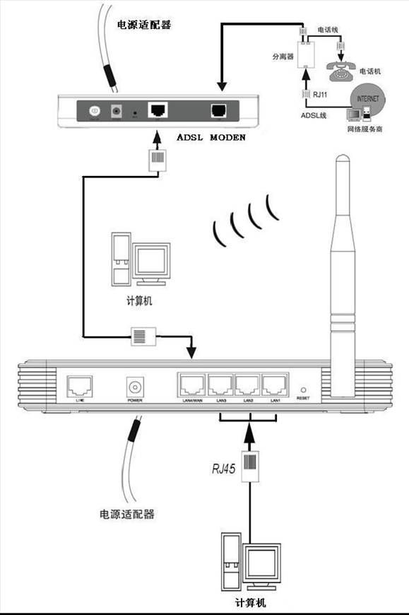 3.1 硬件安装无线ADSL桥模式硬件安装如。