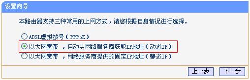STEP 1:选择“以太网宽带,自动从网络服务上获取IP地址(动态IP)”。