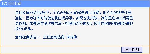 管理页面选择“ADSL设置”-“PVC自动检测”,点击开始检测按钮,自动检测开始。