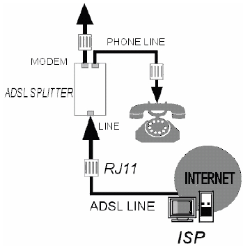 语音分离器正确接法为:入户线连LINE口,ADSL Modem接MODEM口,电话机接PHONE口,如下图所示: