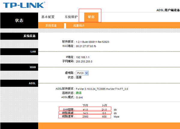 1、如果ADSL Modem只是作为桥接模式接入,先通过在ADSL Modem WEB页面中查看线路衰减、SNR裕量(该值正常情况下为15-40db,如果低于10db,表明当前线路质量不够好)、线路速率等参数,如果这些参数存在异常,请致电服务商检查线路;状态参数可以在我司产品的WEB配置界面中查到,以TD-8620为例,见下图: