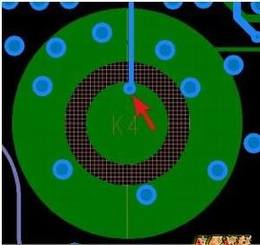如上图,第一次设计时,电池座的负极即中间的焊盘采用十字细颈线连接,实际焊接时,次焊盘很容易脱落,改善措施将其与地改成全连接。