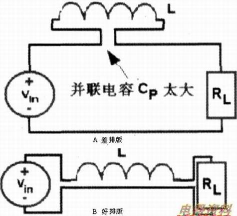 图2(c)显示了在一个PCB上输入电源(VIN)通过电感(L)至负载(RL)的不同走线方式。为了降低电感的Cp,电感的二个引脚应尽量远离。而VIN 正极至RL和VIN 负极至RL上的走线应尽量靠近。
