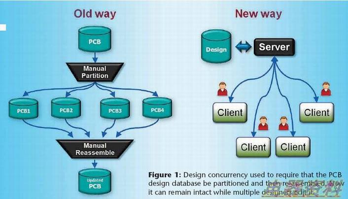 图1:协同设计通常要求PCB设计数据库分拆后再重组,而现在则可以在多名设计师操作时保持完整