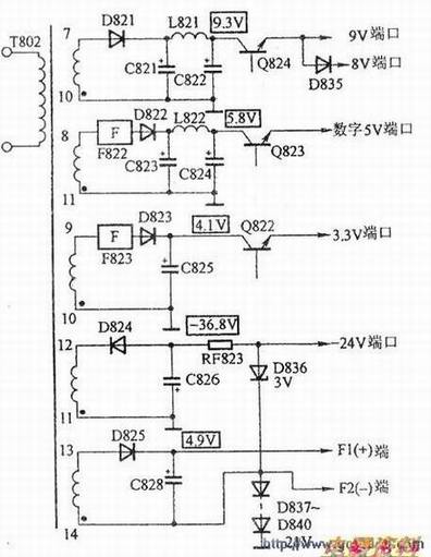 再往前找,可找到T802绕组(11)~(12),以及反向放置的整流二极管D824、滤波C826。脉冲电压经整流、滤波后可输出-36.8V负值直流电压,再经过保险丝降压RF823和群的稳压作用,可输出-24.7V负值直流电压。