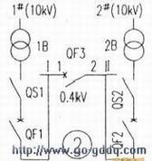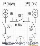 l#(lOkV)进变压器1B降至0.4kV.进刀开关QSI上桩头,再进空气断路器QF1上桩头.QF1空气断路器下桩头出线返回柜顶工段0.7kV母线.2#变压器受电同l#变压器。