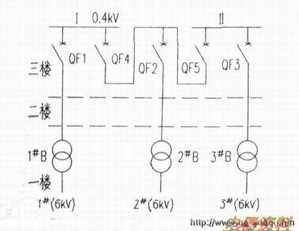 由于变电所土建的影响,会形成空气断路器下桩头进电。例如,某炼铁厂高炉变电所,一楼为变压器室和高压配电室,二楼为电缆隔屡,三楼为低压配电室。由于变压器容量比较大,为1250kVA。用铜排作变压器低压出线,电气图如上图所示。之所以变电空气断路器从下桩头进电,是因为着以上桩头进电,母排要拐二个弯,使母排接头增多,不利于安全运行。