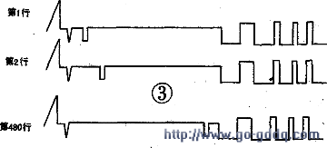 扫描脉冲包括气体放电准备期、寻址期及维持放电期所需脉冲。这些脉冲仍由屏驱动系统控制sc板电压形成。由于等离子屏点排列采用矩阵式排列。如果屏的像素点为852(×3个RCB)×480,它表明垂直方向扫描电极有480条。这480条扫描线的识别由程序控制扫描板产生,提供第1行、第2行…,第480行识别信号,每条行扫描线识别信号位置固定不变,当扫描电极加有此识别脉冲时,将发生一次放电,这样便实现行扫描线识别,图3示意480条行扫描波形图。