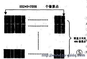 屏像素点按矩阵式排列,见图5。一台42英寸的等离子电视屏分辨率为852(×3个RGB)×480,表明屏水平方向分布的R、G、B等离子体有2556个。而垂直方向分布的等离子体有480个,整个屏幕的RGB等离子体有2556×480个。这就是说,水平方向需要设置2556条寻址电极。全屏共有1226880个等离子体,每个等离子体在屏内空间都与扫描电极、地址电极及维持电极相连。