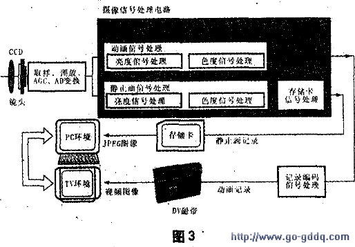音频、视频产品数字技术的发展迎来了数字化时代,并极大地推动了具有国际统一标准的数字摄录机的普及。这种摄录机被称为DV格式的摄录像机,简称DV机,DV是DigitalVideo(数字视频)的简称,图1所示为典型DV摄录像机的外形图。图2是DV格式的录像带,可以看到DV格式的录像带盒体积很小,宽度为6.35mm,因而机芯的尺寸也非常小巧,特别适于制成袖珍式摄录机。由于DV是全数字化产品,它不仅可以与视频设备进行连接而且还可直接与多媒体电脑相连,进行视频、音频编辑及特技等处理。目前许多DV摄录机除了使用DV格式录像带存储动态影像外,还可以通过存储卡像数码相机一样拍摄静止的画面。图3为DV机的应用示意图。