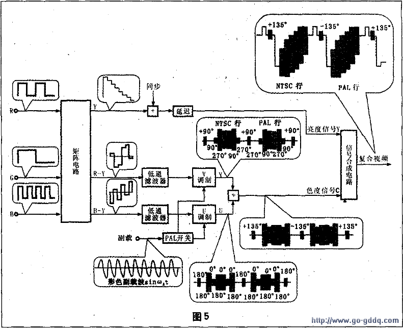 通常我们在使用各种音视频设备时会遇到各种信号,如影碟机、录像机和电视机相互连接所传输的图像信号被称之为视频信号,视频信号在不同的国家或地区有制式的差别,如我国采用PAL制、美日采用NTSC制、俄法采用SECAM制。视频信号是由亮度信号、色度信号、行场同步信号及色同步信号等复合而成,这个信号就是复合视频信号。将视频信号经Y/c分离分成亮度信号(Y)和色度信号(C),这种信号被称为Y/C分离信号或称S一视频信号。将视频信号经处理而形成亮度信号(Y)和两个色差信号(R-Y、B-Y),这种信号则被称为分量信号。色差信号又称为U、V信号,或称Pr、Pb信号,也有些场合称为Cr、Cb信号。使用分量信号记录或传输视频图像信号无亮度和色度的相互干扰问题。因而图像质量高,但它需要同时传输两路或三路信号。我们在过去的电视机、录像机中所处理的上述信号都是模拟信号,如将这些信号经A/D变换器转换成数字信号,就是数字式摄录机所处理的信号。因而数字信号也分为复合式和分量式。图5是视频信号的处理过程。三基色图像信号经矩阵电路后形成亮度信号Y和两个色差信号,两色差信号在经过调制合成形成色度信号C,亮度信号和色度信号再相加形成视频全电视信号,即复合视频信号。从图5所见,表示图像的信号可以有多种格式,其中有R、G、B信号,分量信号、Y/C分离信号等都需要多路信号同时传输和记录。