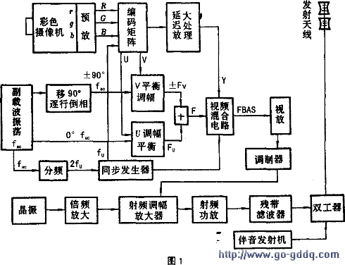 图1是PAL制彩色电视发送系统的方框图。它的工作过程是这样的;复合同步、复合消隐信号混合形成彩色全电视信号FBAS.FBAS再经视放放大后送至。