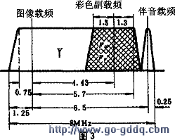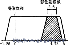 由于色度信号是用带宽为1.3MHz的两个色差信号经平衡正交调幅形成的,因此,它占有的频带宽度为2.6MHz.色度信号的频谱交织在亮度频谱之间,因此它与亮度信号~道对图像载频调幅及残带滤波后,射频彩色全电视信号应有如图2所示的频率特性曲线。显然,每个频道的射频FBAS信号占有的频带宽度同样占有0.5 图2MHz的。我国的制式规定,伴音载频与图像载频相距6.5MHz,如图3所示。可见,每一频道的彩色图像和伴音占有8MHz的频带宽度。