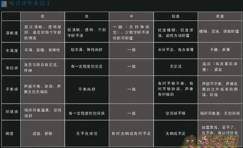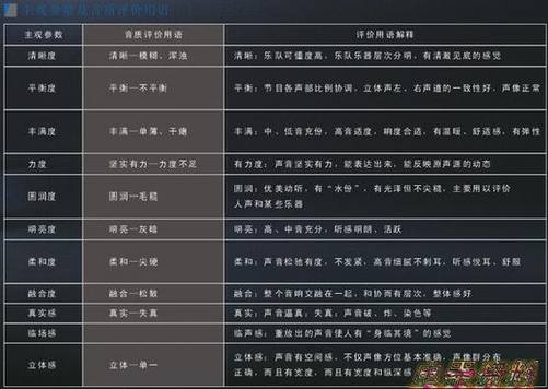 音质的评价用语有许多,但有些评价用语不太准确且有含混不清或重要的地方,为此,专家们确定了一些最能描述声音主观属性的参量,以及参量的形容词作为主观评价的常用术语,如丰满度的用语是丰满、干瘪等。国内的声学专家经过很多的研究、实践,比较多地推荐表所示的11种主观参量和音质评价用语作为对音质的评价。