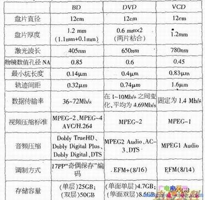 BD、DVD、VCD光盘结构和识读光点比较如下图所示.这三种光盘的参数对照如下表所列。