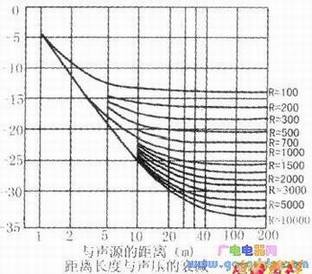 如果是在室内等有限空间传播时,底面、墙壁、顶棚等反射声和声源的直接声就会混合在一起,因此,限于一定距离内,按上述逆平方率规律,声压会降低。但距离再长一些,反射声比直接声随之增大,超过了一定距离,声压线几乎没有变动。距离长度与声压衰减的关系见下图。
