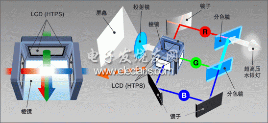 每一个3LCD光路系统都是 由3块HTPS构成。将灯光源发出的光通过分色镜A分出红色光,再通过分色镜B分为绿色光和蓝色光,三种 颜色的光分别投射到三块相对应的液晶板上,并经过中间的棱镜将三原色光进行混合后投射出不同颜色的 图像。